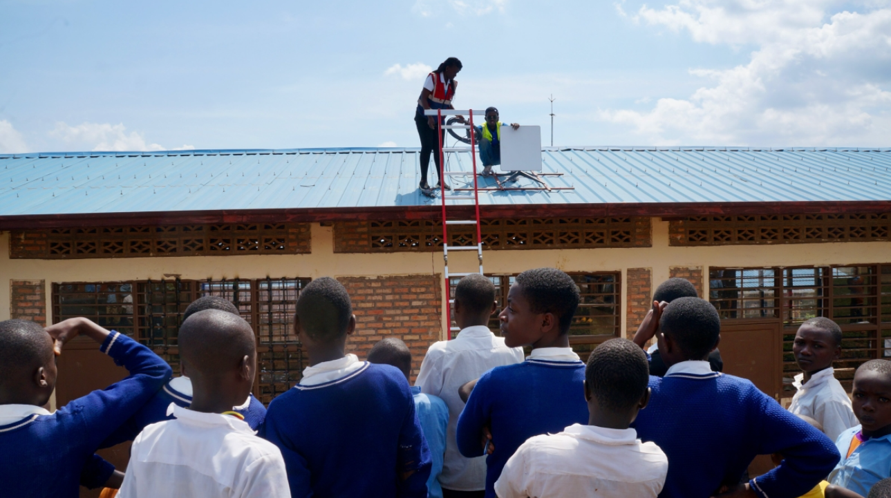 기술자들이 50개 학교 중 한 곳에 Starlink 인터넷을 설치하는 모습 [그림출처: 원문자료]